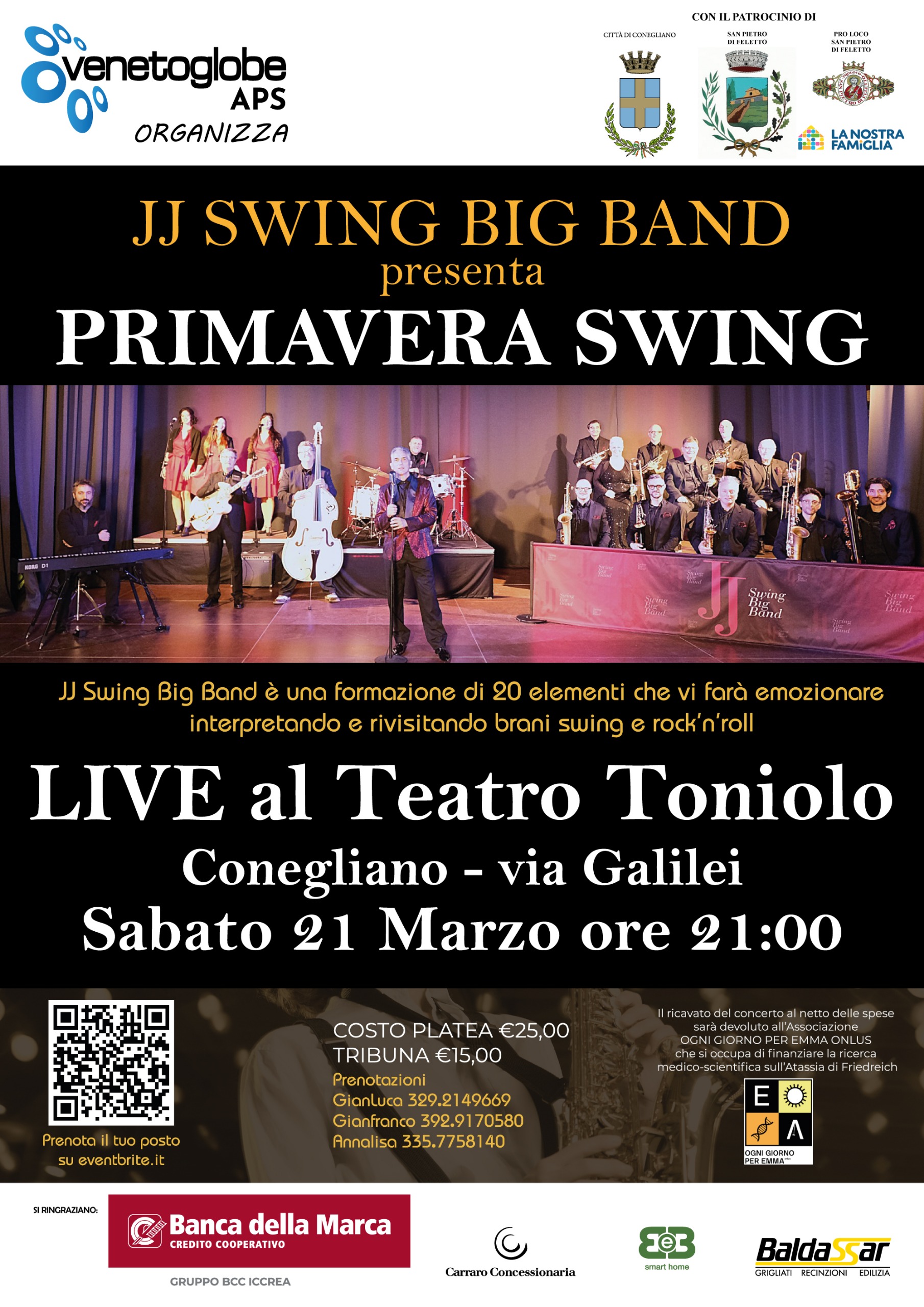 Sabato 21 marzo alle ore 21.00 al Teatro Toniolo di Conegliano la JJ Swing Big Band festeggerà il primo giorno di primavera con un concerto live dedicato alla raccolta di fondi per l’Associazione “Ogni Giorno per Emma Onlus” che da anni si occupa della ricerca medico-scientifica sull’Atassia di Friedreich.